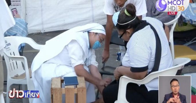 กลุ่มแพทย์และเจ้าหน้าที่สาธารณสุขบนเรือพยาบาลยูเอส เนเวิลชิพ คอมฟอร์ตเข้าเทียบท่าที่เมืองปาอีตาของเปรูเพื่อบริการด้านสาธารณสุขพื้นฐาน