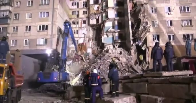 เจ้าหน้าที่กู้ภัยรัสเซียที่เร่งค้นหาผู้รอดชีวิตในซากอะพาร์ตเมนต์ที่ได้รับความเสียหายจากเหตุแก๊สระเบิดในวันก่อนวันขึ้นปีใหม่
