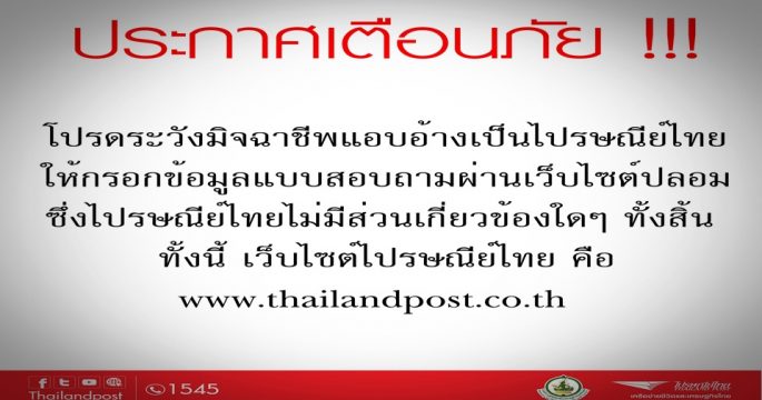 ไปรษณีย์ไทย แจ้งเตือนผู้ใช้บริการ ไม่มีนโยบายให้ตอบแบบสอบถามทางอีเมล์ลุ้นรางวัลโทรศัพท์มือถือ หลังพบถูกหลอกไปแล้วหลายราย