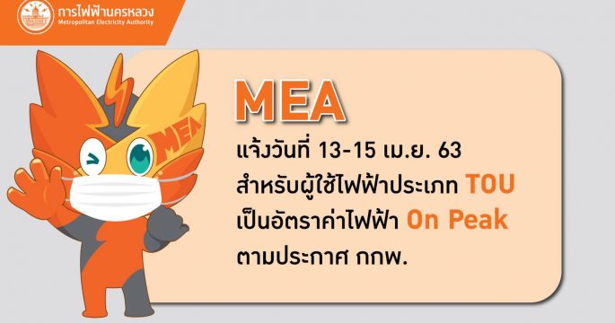 MEA แจ้งวันที่ 13-15 เม.ย. 63 สำหรับผู้ใช้ไฟฟ้าประเภท TOU เป็นอัตราค่าไฟฟ้า On Peak ตามประกาศ กกพ.