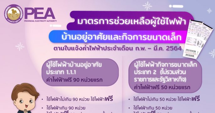 PEA ออกมาตรการช่วยเหลือค่าไฟฟ้าสำหรับผู้ใช้ไฟฟ้าประเภทบ้านอยู่อาศัยและกิจการขนาดเล็กตามมติคณะรัฐมนตรีเมื่อวันที่ 12 มกราคม 2564 เป็นเวลา 2 เดือน ตั้งเเต่ ก.พ.- มี.ค.64