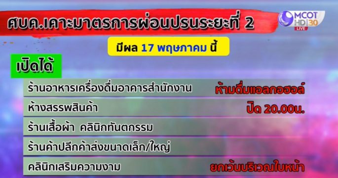 ศบค.มีมติให้ผ่อนปรนกิจกรรม/กิจการ ระยะที่ 2 เริ่มวันอาทิตย์ที่ 17 พ.ค.นี้ พร้อมขยายเวลาเคอร์ฟิวเป็น 23.00-04.00 น.