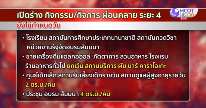 รัฐบาลเตรียมคลายล็อกระยะ 4 วันนี้มีการเปิดร่างแนวทางผ่อนปรนกิจการและกิจกรรมให้ประชาชนได้ใช้ชีวิตประจำวันได้มากขึ้น ส่วนผับบาร์อาจยังเปิดไม่ได้ แต่ร้านอาหาร โรงแรม อนุโลมให้นั่งดื่มสุราได้