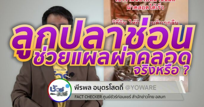 10 มกราคม 2568 – บนโซเชียลแชร์แนะนำว่า ถ้าใครเพิ่งผ่าตัดคลอดมา ให้กินลูกปลาช่อนเป็น ๆ มันเป็นยาอย่างดีของคนผ่าตัด ให้ช่วยสมานแผลได้เร็วขึ้น บทสรุป : ข้อมูลที่ระบุว่าการกินลูกปลาช่อนสดช่วยให้แผลผ่าคลอดหายเร็วขึ้นนั้น ไม่เป็นความจริง และอาจเป็นอันตรายต่อสุขภาพ ศูนย์ชัวร์ก่อนแชร์ ตรวจสอบกับ ศ.ดร.พญ. รังสิมา วณิชภักดีเดชา หัวหน้าภาควิชาตจวิทยา คณะแพทยศาสตร์ศิริราชพยาบาล มหาวิทยาลัยมหิดล สัมภาษณ์เมื่อ 8 มกราคม 2568 ศ.นพ.ดร.เผด็จ สิริยะเสถียร อาจารย์ประจำ ภาควิชาปรสิตวิทยา คณะแพทยศาสตร์ จุฬาลงกรณ์มหาวิทยาลัย โดยแพทย์ผู้เชี่ยวชาญได้ออกมาชี้แจงว่า ข้อมูลดังกล่าวไม่เป็นความจริง ตรวจสอบข้อเท็จจริงโดย : พีรพล อนุตรโสตถิ์เรียบเรียงโดย : ชยานิษฐ์ ผ่องใส