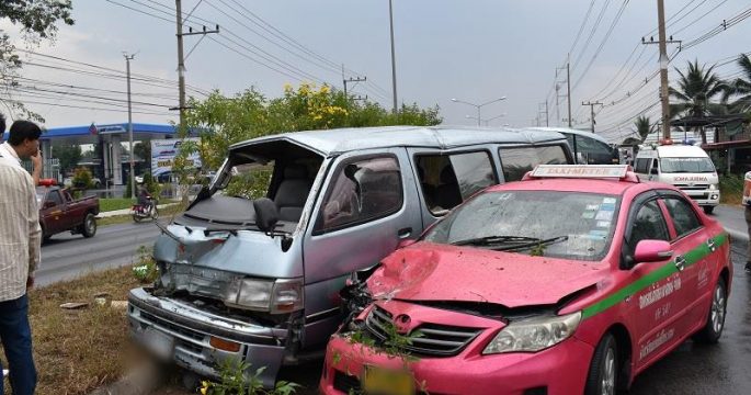สมุทรสาครฝนตกถนนชื้นรถตู้บรรทุกโลงศพและอุปกรณ์จัดงานเสียหลักพุ่งข้ามฝั่งชนแท็กซี่เสียหาย เคราะห์ดีเจ็บเล็กน้อย