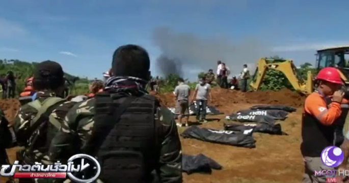 คนงานฉุกเฉินของฟิลิปปินส์ จัดการฝังศพผู้เสียชีวิตจากการสู้รบในเมืองมาราวี 28 ศพ ที่เชิงเขาแห่งหนึ่งในเมืองมาราวี เจ้าหน้าที่ท้องถิ่นเผยตั้งแต่เดือนมิถุนายน มีการฝังศพไปแล้ว 88 ศพ