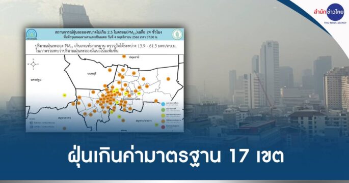 ศูนย์แก้ไขปัญหามลพิษทางอากาศ แจ้งเตือน 17 เขตของ กทม. ปริมาณฝุ่น PM2.5 เกินค่ามาตรฐาน เหตุจากมวลอากาศเย็นเริ่มเข้ามาปกคลุม ประกอบกับลมอ่อน ทำให้การระบายฝุ่นละอองไม่ดีเท่าที่ควร ควรเฝ้าระวังสุขภาพ