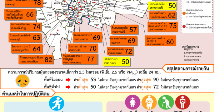 สถานการณ์ฝุ่นละอองขนาดไม่เกิน 2.5 ไมครอน (pm2.5)ของ กทม. ประจำวันอังคารที่ 15 มกราคม พ.ศ. 2562 ตรวจวัดได้ 53-90 ไมโครกรัม/ลูกบาศก์เมตร เกินมาตรฐาน 20 บริเวณ