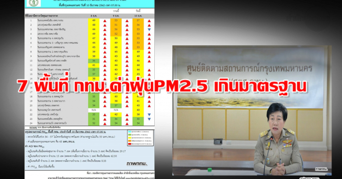 ค่าฝุ่น PM2.5 ใน กทม.วันนี้ เกินมาตรฐาน 7 พื้นที่ แนะควรลดการทำกิจกรรมนอกบ้าน และสวมหน้ากากอนามัยป้องกัน