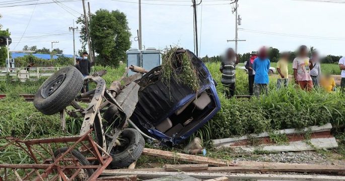 ไม่หยุดรอ! รถกระบะบรรทุกวัวขับอ้อมเครื่องกั้นจุดตัดทางรถไฟบ้านโป่ง-ราชบุรี หน้าวัดหนองกบ ถูกขบวนรถไฟสายใต้ชน บาดเจ็บ 1 เสียชีวิต 1 พร้อมวัวอีกตัว