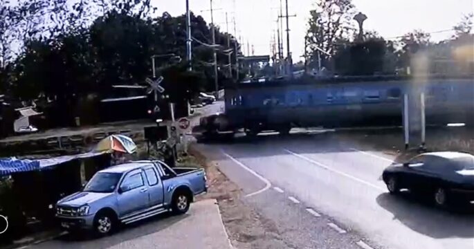 ภาพวงจรปิดรถไฟชนกระบะฝ่าเครื่องกั้น