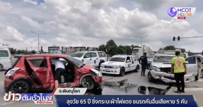 ชายวัย 65 ปี ขับรถกระบะฝ่าไฟแดงสี่แยกหนองอ้อ อ.เมือง พิษณุโลก ชนรถเสียหาย 5 คันรวด มีผู้บาดเจ็บ 3 คน