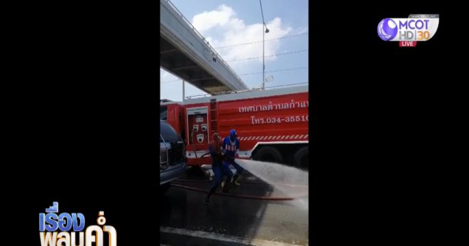 พนักงานดับเพลิง แต่งชุดสไปเดอร์แมน-กัปตันอเมริกา ฉีดน้ำล้างพื้นถนน