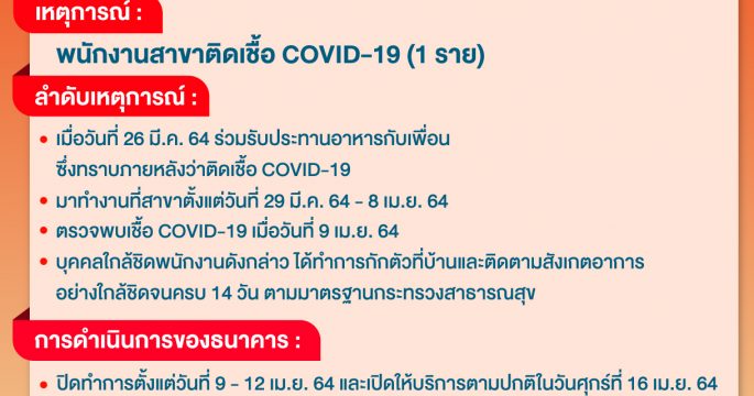 ธนาคารกรุงเทพ แจ้งพบพนักงานที่ศูนย์หลักประกันและจดจำนอง อาคารสำนักพลับพลาไชย ติดโควิด 1 ราย แนะลูกค้าที่รับการบริการจากพนักงานคนดังกล่าว ช่วงวันที่ 19 มี.ค.-1 เม.ย.64 เข้ารับการตรวจหาเชื้อ หรือกักตัวเองสังเกตอาการ 14 วัน