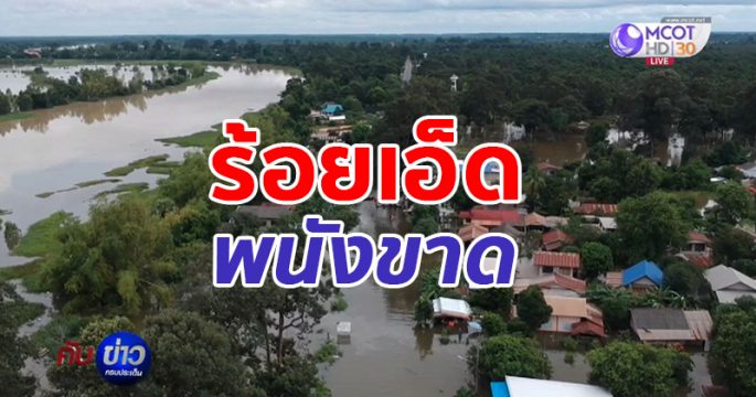 มวลน้ำทะลักทำพนังกั้นน้ำชีจุดใหม่ขาดอีก ระยะทาง 7 เมตร บริเวณบ้านโนนเมือง อ.กมลาไสย จ.กาฬสินธุ์ รถไม่สามารถสัญจรผ่านได้