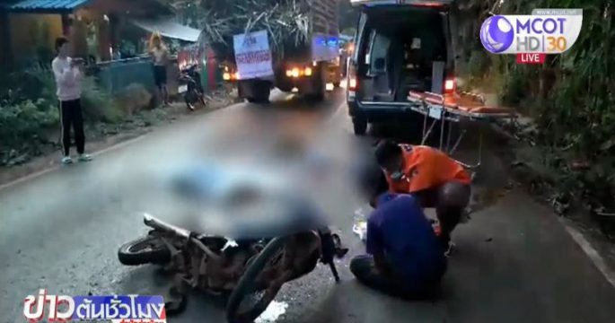 รถจักรยานยนต์เร่งเครื่องแซงรถบรรทุกอ้อยไม่พ้น รถข้ามเลนมาชนรถจักรยานยนต์อีกคันพลิกคว่ำร่างกระเด็นถูกรถบรรทุกอ้อยทับร่างเสียชีวิต 1 บาดเจ็บ 2 คน