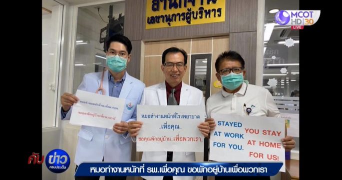 บุคลากรทางการแพทย์ ต่างร่วมถือป้าย หมอทำงานหนักที่ รพ.เพื่อคุณ ขอคุณอยู่บ้านเพื่อพวกเรา ลงโซเชียลมีเดีย เพื่อย้ำการลดไปแหล่งชุมชน ผับ บาร์ เลี่ยงไม่ได้ต้องป้องกันตัวเอง