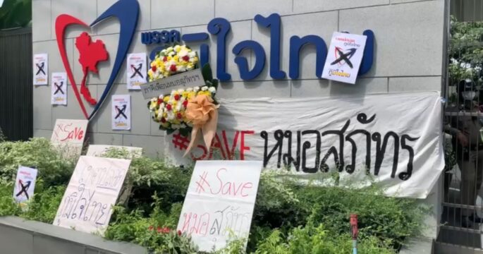 กลุ่มเพื่อนหมอสุภัทรฯ ยกพวงหรีดแขวนหน้าพรรคภูมิใจไทย จี้ทบทวนคำสั่งย้าย อ้างไม่เป็นธรรม มีการเมืองแอบแฝง