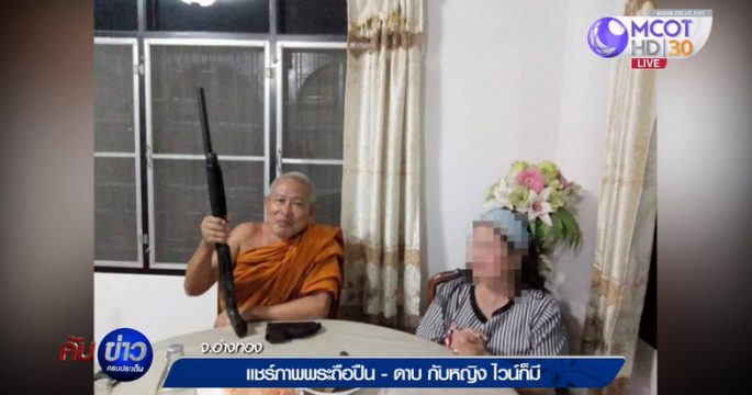 สังคมโซเชียลใน จ.อ่างทอง แห่แชร์ภาพพระรูปหนึ่ง แสดงกริยาไม่เหมาะสม นำอาวุธปืนและดาบถือโชว์ถ่ายภาพสนุกสนาน เลขาฯ เจ้าคณะจังหวัด เร่งตรวจสอบใช่พระในจังหวัดหรือไม่