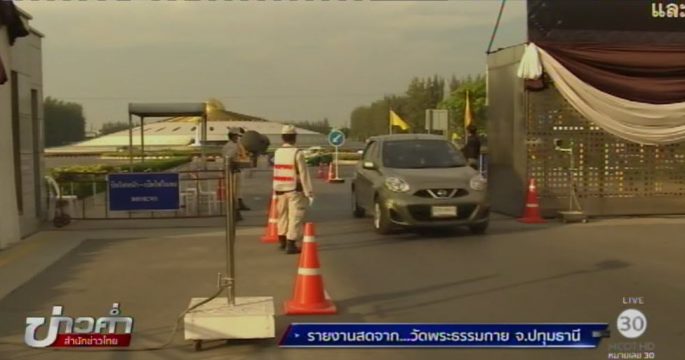 ตำรวจ สภ.คลองหลวง ห่วงมือที่ 3 ฉวยโอกาสก่อกวนในคดีพระธัมมชโย ตั้งจุดสกัดบนถนนสายสำคัญ ขณะที่ รปภ.วัดตรวจเข้มรถทุกคันผ่านเข้า-ออก บางประตูตั้งเหล็กปิดขวาง