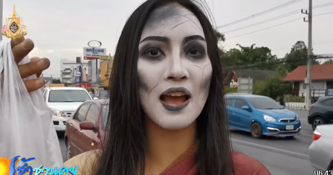 ฮือฮา! สาวแต่งกายเป็นแม่นาคพระโขนงอุ้มลูกเร่ขายหมูปิ้ง กลางสี่แยกวัดพระญาติ จ.พระนครศรีอยุธยา ผู้พบเห็นต่างให้ความสนใจเรียกซื้อหมูปิ้ง และถ่ายรูปลงโซเชียล