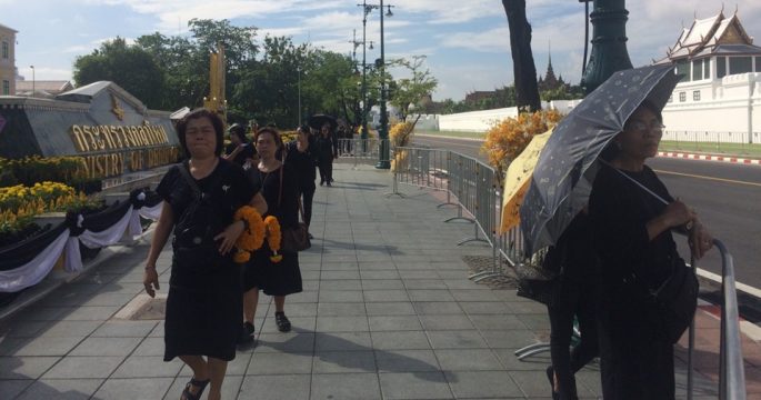 พสกนิกรที่ไม่มีโอกาสได้เข้ากราบถวายบังคมพระบรมศพ นำพวงมาลัยมาถวายสักการะพระบรมฉายาลักษณ์ที่ประดิษฐานข้างกำแพงวัง