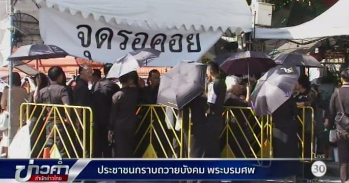 วันนี้ประชาชนทยอยมากราบถวายบังคมพระบรมศพ พระบาทสมเด็จพระปรมินทรมหาภูมิพลอดุลยเดช อย่างต่อเนื่อง การจัดระบบคิวเป็นไปด้วยความเรียบร้อยดี ไม่มีปัญหาการแทรกคิว