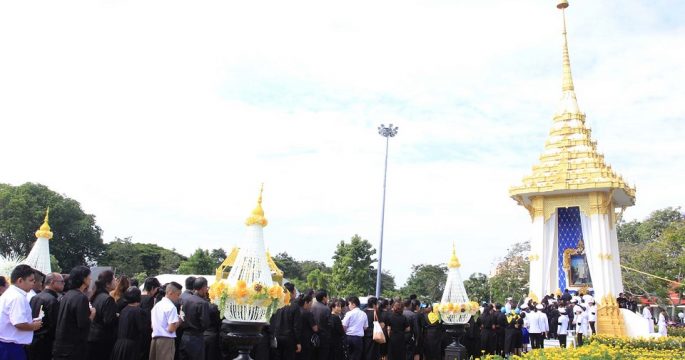 นครศรีธรรมราช 25 ต.ค.– ชาวนครศรีฯ ซาบซึ้งพระมหากรุณาธิคุณเป็นล้นพ้นร่วมพิธีวางดอกไม้จันทน์อย่างเนืองแน่น แม้ฝนกระหน่ำ ด้านผู้ว่าฯ ปรับแผนดูแลให้สะดวกรวดเร็วขึ้น บรรยากาศบริเวณพระเมรุมาศจำลอง สนามหน้าเมืองนครศรีธรรมราช ยังคงหนาตาไปด้วยประชาชนพากันเดินทางมาเพื่อร่วมพิธีวางดอกไม้จันทน์ในงานพระราชพิธีถวายพระเพลิงพระบรมศพพระบาทสมเด็จพระปรมินทรมหาภูมิพลอดุลยเดช บรมนาถบพิตร (รัชกาลที่ 9) แม้ช่วงเวลา 11.00-11.30 น. เกิดฝนตกหนัก แต่ประชาชนทุกคนไม่ย่อท้อ แม้จะต้องรอแถวอยู่ด้านนอกเต็นท์ไม่ยอมหลบสายฝน ทั้งนี้ ทุกคนต่างมีความมุ่งมั่นตั้งใจที่จะมาร่วมพิธีเพื่อถวายความอาลัยด้วยความซาบซึ้งในพระมหากรุณาธิคุณสุดหาที่ใดเปรียบปาน ด้านนายจำเริญ ทิพญพงศ์ธาดา ผู้ว่าราชการจังหวัดนครศรีธรรมราช เป็นห่วงประชาชนจึงได้ปรับแผนใหม่ให้ประชาชนเข้าวางดอกไม้จันทน์ได้เพิ่มขึ้น จากเดิมครั้งละ 10 คน เป็น 40 คน ทำให้การใช้เวลาไปเป็นอย่างรวดเร็ว.–สำนักข่าวไทย