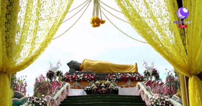 พุทธศาสนิกชนร่วมงานวันอัฎฐมีบูชา จัดขบวนเหตุการณ์สมมุติ พิธีอัญเชิญพระบรมศพ พระพุทธเจ้าจำลอง ที่วัดใหม่สุคนธาราม อ.นครชัยศรี จ.นครปฐม