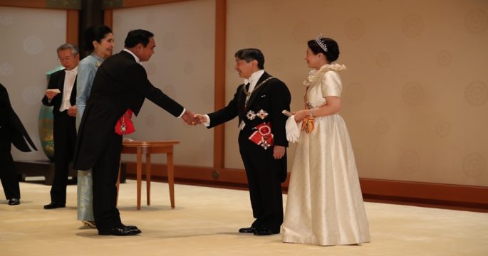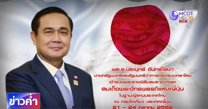 นายกรัฐมนตรี ร่วมแสดงความยินดีเนื่องในโอกาสพระราชพิธีบรมราชาภิเษกของสมเด็จพระจักรพรรดิแห่งญี่ปุ่น ขณะที่นายกรัฐมนตรีญี่ปุ่นเตรียมเดินทางเข้าร่วมประชุมสุดยอดอาเซียนที่ไทยเป็นเจ้าภาพเดือนหน้า โทรทัศน์รวมการเฉพาะกิจแห่งประเทศไทยรายงาน