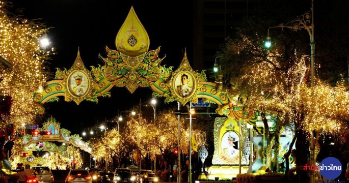 บรรยากาศการประดับไฟยามค่ำคืน บริเวณลานพระบรมรูปทรงม้า และถนนราชดำเนิน เส้นทางเสด็จพระราชดำเนินเลียบพระนครโดยขบวนพยุหยาตราทางสถลมารค