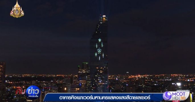 ตึก คิง เพาเวอร์ มหานคร จัดแสดง แสงสี ฉายเลเซอร์ (Laser and Lighting Show) เทิดพระเกียรติสมเด็จพระเจ้าอยู่หัว ในโอกาสงานพระราชพิธีบรมราชาภิเษก