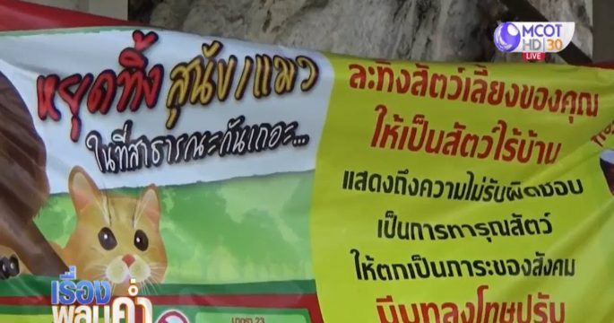 พระอธิการจำนงค์ กิตติสาโร เจ้าอาวาสวัดหัวเขาและสามเณร กำลังช่วยกันดึงแผ่นไวนิล ที่ อบต.นาหมื่นศรี นำมาปิดประกาศ ห้ามทิ้งหมาแมวในที่สาธารณะให้ พร้อมข้อคิดเตือนใจและบทลงโทษมาติดไว้นาน 2 เดือน