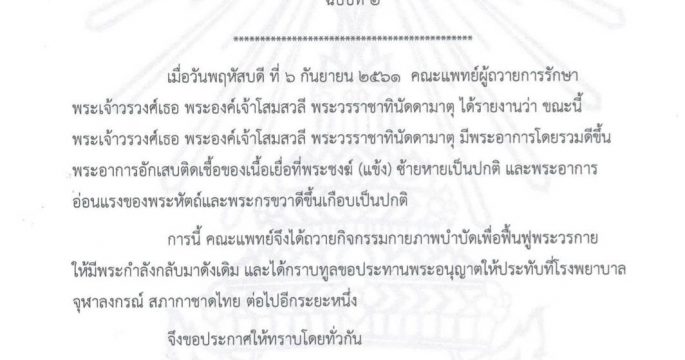 แถลงการณ์สำนักพระราชวัง เรื่อง พระเจ้าวรวงศ์เธอ พระองค์เจ้าโสมสวลี พระวรราชาทินัดดามาตุ เสด็จไปประทับ ณ โรงพยาบาลจุฬาลงกรณ์ สภากาชาดไทย ฉบับที่ ๒ เมื่อวันพฤหัสบดี ที่ ๖ กันยายน ๒๕๖๑ คณะแพทย์ผู้ถวายการรักษารายงานว่า ขณะนี้ พระเจ้าวรวงศ์เธอ พระองค์เจ้าโสมสวลี พระวรราชาทินัดดามาตุ มีพระอาการโดยรวมดีขึ้น พระอาการอักเสบติดเชื้อของเนื้อเยื่อที่พระชงฆ์ (แข้ง) ซ้ายหายเป็นปกติ และพระอาการอ่อนแรงของพระหัตถ์และพระกรขวาดีขึ้นเกือบเป็นปกติ การนี้ คณะแพทย์จึงได้ถวายกิจกรรมกายภาพบำบัดเพื่อฟื้นฟูพระวรกายให้มีพระกำลังกลับมาดังเดิม และได้กราบทูลขอประทานพระอนุญาตให้ประทับที่โรงพยาบาลจุฬาลงกรณ์ สภากาชาดไทย ต่อไปอีกระยะหนึ่ง
