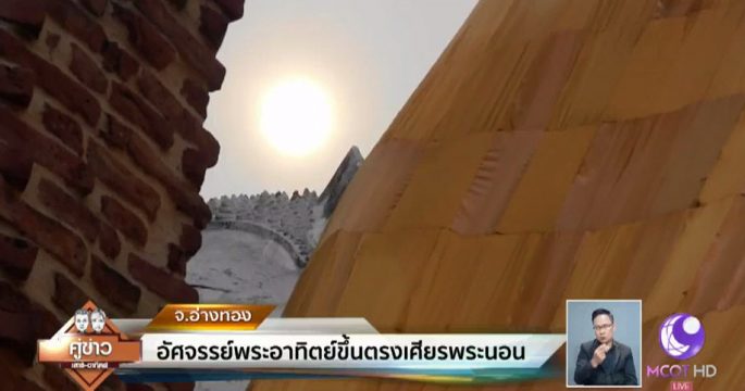 องค์พระนอนวัดขุนอินทประมูล ต.อินทประมูล อ.โพธิ์ทอง จ.อ่างทอง มีคณะพราหมณ์พร้อมประชาชน เดินทางมาดูปรากฏการณ์มหัศจรรย์พระอาทิตย์ขึ้นตรงเศียรพระพุทธไสยาสน์เลอไทนฤมิตร