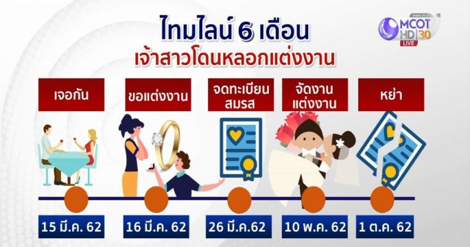 กรณีพริตตี้สาวชาวบุรีรัมย์ร้องถูกเจ้าบ่าวอ้างเป็นเสี่ยหมื่นล้าน หลอกแต่งงานจนเป็นหนี้กว่า 3.5 ล้านบาท สำนักข่าวไทย แกะรอยเส้นทาง “รักแรกพบ” ของอดีตเจ้าสาวและอดีตเจ้าบ่าวรายนี้ มีไทม์ไลน์ดังนี้