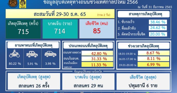 ศปถ. สรุปสถิติอุบัติเหตุทางถนน วันที่ 30 ธ.ค.65 เกิดอุบัติเหตุ 366 ครั้ง เสียชีวิต 48 ราย รวมสองวันการรณรงค์ลดอุบัติเหตุเทศกาลปีใหม่ 2566 เกิดอุบัติเหตุรวม 715 ครั้ง มีผู้เสียชีวิตรวม 85 ราย จ.ปทุมธานี มีผู้เสียชีวิตสะสมสูงสุด 6 ราย เร่งประสานจังหวัดกวดขันพฤติกรรมเสี่ยง