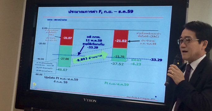 กกพ.เตือนประชาชนทำใจค่าไฟฟ้าเอฟทีงวดต้นปี 2560 ( ม.ค.-เม.ย.) จะปรับขึ้นตามราคาน้ำมัน โดยอาจปรับขึ้น 8-11สตางค์ต่อหน่วย หลังงวดปลายปี 2559 ตรึงราคาที่ ติดลบ 33.29สตางค์ต่อหน่วย