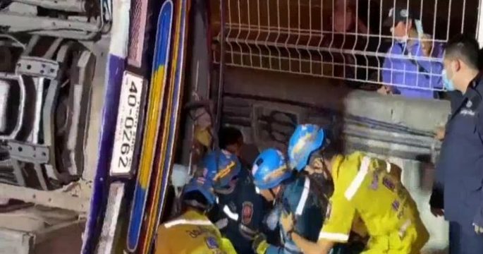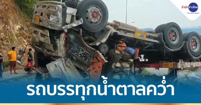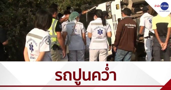 ฝนตกถนนลื่น รถสิบล้อบรรทุกคนงานก่อสร้างหลุดโค้งพลิกคว่ำ เสียชีวิต 2 ราย บาดเจ็บสาหัส 6 ราย