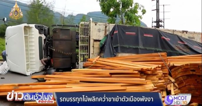 รถบรรทุกไม้พลิกคว่ำบนถนนเทศบาลบำรุง ขาเข้าตัวเมืองพังงา ไม้แปรรูปตกกระจายเกลื่อนถนน สาเหตุคาดเกิดจากสายรัดไม้ขาด