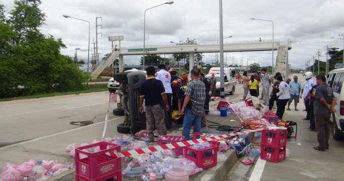 กระบะส่งน้ำดื่มล้อหลุดกลางถนนลำปางดับ 1 เจ็บ 1