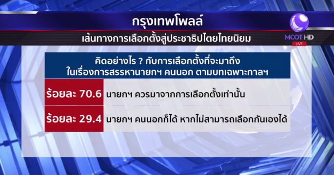 หลังจากมีแนวโน้มว่า เส้นทางสู่การเลือกตั้ง อาจถูกเลื่อนไปถึงปีหน้า มีผลสำรวจของกรุงเทพโพลล์มาฝาก โดยประเด็นที่น่าจับตา คือ ประชาชนร้อยละ 70 เห็นว่า นายกรัฐมนตรีควรมาจากการเลือกตั้ง และคนส่วนใหญ่ยังสนับสนุนพลเอกประยุทธ์ เป็นนายกรัฐมนตรี