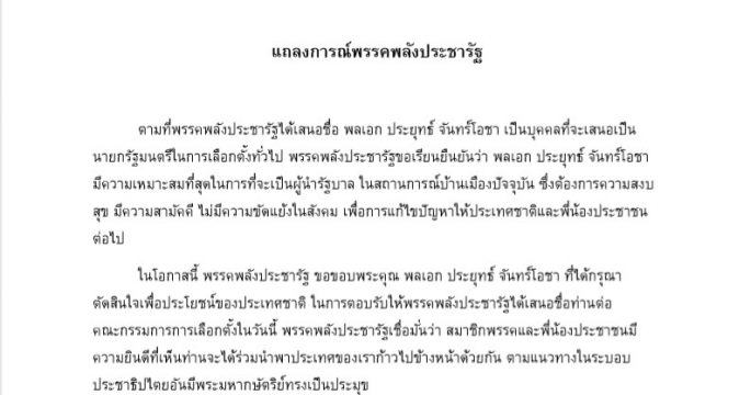 พปชร. ขอบคุณพลเอกประยุทธ์ ตอบรับให้เสนอชื่อเป็นนายกฯ