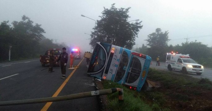 เกิดอุบัติเหตุรถทัวร์ กทม.-เชียงใหม่ ชนเสาไฟพลิกตกร่องถนนพหลโยธิน-ลำปาง ท่ามกลางหมอกหนาจัด ผู้โดยสารเจ็บ 13 ราย