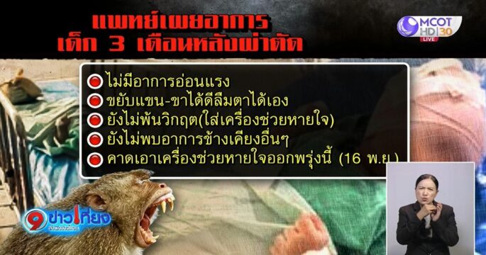 พังงา 15 พ.ย. – ผ่าตัดผ่านไปด้วยดี เด็ก 3 เดือน ถูกลิงแสมกัด แต่ยังใส่เครื่องช่วยหายใจ แพทย์ยอมรับเป็นเคสแรกที่เด็กวัยเพียง 3 เดือน ถูกลิงกัดจนกระโหลกศีรษะแตก ทิ่มเนื้อสมอง กรณีเด็กชายวัย 3 เดือนเศษ อาศัยอยู่บ้านเกาะไม้ไผ่ อำเภอเมืองพังงา ถูกลิงแสม 2 ตัว ในป่าโกงกางบุกบ้าน และแย่งขวดนมที่น้องกำลังนอนกินอยู่ ทำให้เกิดการยื้อแย่ง จากนั้นลิงได้กัดหัวน้อง โดยมีรอยเขี้ยว 5-6 รอย และแผลกะโหลกศีรษะเปิด 1 แผล เลือดไหลทะลัก ญาติรีบพาส่ง รพ.สต.เกาะไม้ไผ่ ให้ช่วยห้ามเลือด ทำแผล ก่อนนำเรือออก เพื่อพาน้องมาส่งท่าเรือบ้านท่าด่าน และประสานหน่วยกู้ชีพโรงพยาบาลพังงา มารับส่งที่ห้องฉุกเฉิน เพื่อให้แพทย์ช่วยเหลือ แต่ภายหลังแพทย์ทำซีทีสแกน และรักษาในเบื้องต้น พบว่าอาการค่อนข้างรุนแรง เพราะแผลได้เจาะลึกไปถึงเนื้อสมอง แพทย์โรงพยาบาลพังงา จึงตัดสินใจส่งตัวน้องไปโรงพยาบาลวชิระ ภูเก็ต เพื่อผ่าตัดเป็นการด่วน ล่าสุดเช้านี้ นายแพทย์วีระศักดิ์ หล่อทองคำ ผู้อำนวยการโรงพยาบาลวชิระภูเก็ต […]
