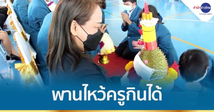 ราชบุรี 2 มิ.ย. – พิธีไหว้ครูของโรงเรียนสาธิตแห่งมหาวิทยาลัยราชภัฏหมู่บ้านจอมบึง ต.ดอนตะโก อ.เมือง จ.ราชบุรี จัดพานตามจินตนาการนักเรียน แบ่งออกเป็น 2 ประเภท คือ ประเภทสวยงาม และความคิดสร้างสรรค์ พานส่วนใหญ่นำดอกไม้สดหลากสีสันสวยงามมาประดิษฐ์ และยังมีสิ่งประดิษฐ์อื่นๆ ที่นำมาจัดตกแต่ง หลายพานทำแบบง่าย ๆ ทั้งพานถุงมือประดิษฐ์ด้วยโฟม พานครูที่นำหมวกปริญญาทำด้วยกระดาษมาตกแต่งบนพานสื่อถึงความสำเร็จด้านการศึกษา ส่วนอีกพานใช้กระดาษประดิษฐ์เป็นเรือมีดอกเข็ม ธูปเทียนแพ สื่อถึงครูเปรียบเหมือนเรือจ้างที่สั่งสอนให้ความรู้นักเรียนให้มีการศึกษาที่ดี บางพานยังนำผลไม้ที่ชอบนำมาวางใส่รวมกัน แต่ที่น่าสนใจแปลกแหวกแนวไม่เหมือนใครในประเภทความคิดสร้างสรรค์ คือ นำลูกทุเรียนซื้อมาราคาลูกละ 300 บาท มาวางใส่พาน และคาดหน้ากากอนามัยที่ลูกทุเรียน ด้านบนตกแต่งด้วยธูปเทียนแพ ด้านล่างตกแต่งด้วยดอกดาวเรือง กลิ่นทุเรียนส่งกลิ่นหอมทั่วห้อง ตัวแทนกลุ่มนักเรียนประดิษฐ์พานทุเรียนฟีเวอร์ บอกว่า กลุ่มช่วยกันทำ 7 คน ทุเรียนถือเป็นผลไม้ขึ้นชื่อของเมืองไทยอยู่แล้ว ชาวต่างชาติก็รู้จักด้วย และอยากคิดจะลองชิม ช่วงนี้เป็นหน้าทุเรียนด้วย ส่วนที่ปิดหน้ากากอนามัยเพราะอยู่ในช่วงสถานการณ์โควิด จึงอยากให้ทุกคนรักษาสุขภาพ. – สำนักข่าวไทย