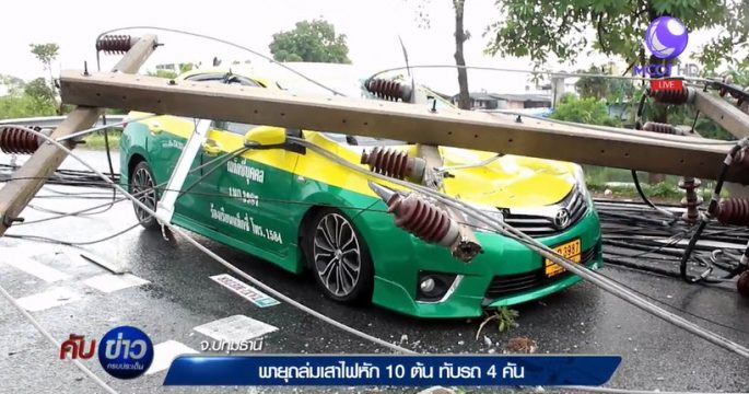 พายุฤดูร้อนพัดถล่มเมืองปทุมฯ เสาไฟฟ้าแรงสูง 14 เมตรหักโค่น 10 ต้น ทับรถยนต์เสียหายไป 4 คัน และมีผู้บาดเจ็บ 4 คน