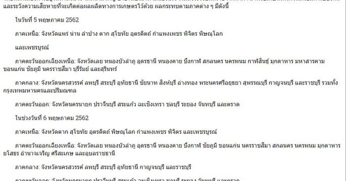 กรมอุตุนิยมวิทยา ประกาศเตือนพายุฤดูร้อนบริเวณประเทศไทยตอนบน (มีผลกระทบตั้งแต่วันที่ 5-6 พฤษภาคม 2562) ฉบับที่ 11 ลงวันที่ 05 พฤษภาคม 2562