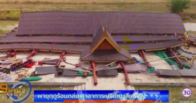 พายุฤดูร้อน ฝนตกหนัก และลมกระโชกแรง พัดศาลาการเปรียญวัดป่าบุพนิมิตร บ้านหนองหิน อ.เมือง จ.มหาสารคาม ซึ่งอยู่ระหว่างก่อสร้างพังถล่มทั้งหลัง
