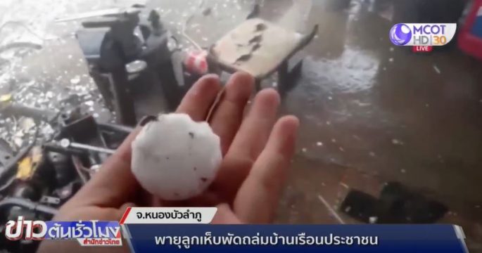 พายุลูกเห็บพัดถล่มในพื้นที่ อ.นาวัง จ.หนองบัวลำภู ชาวบ้านถ่ายคลิปลูกเห็บตกไว้ได้ ขนาดใหญ่กว่าไข่ไก่ ทำให้หลังคาบ้านเรือน ร้านค้า ป้อมตำรวจ ได้ความเสียหาย